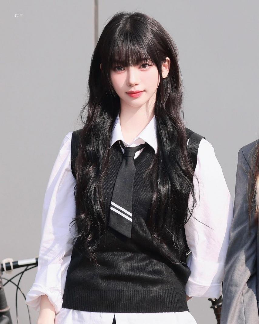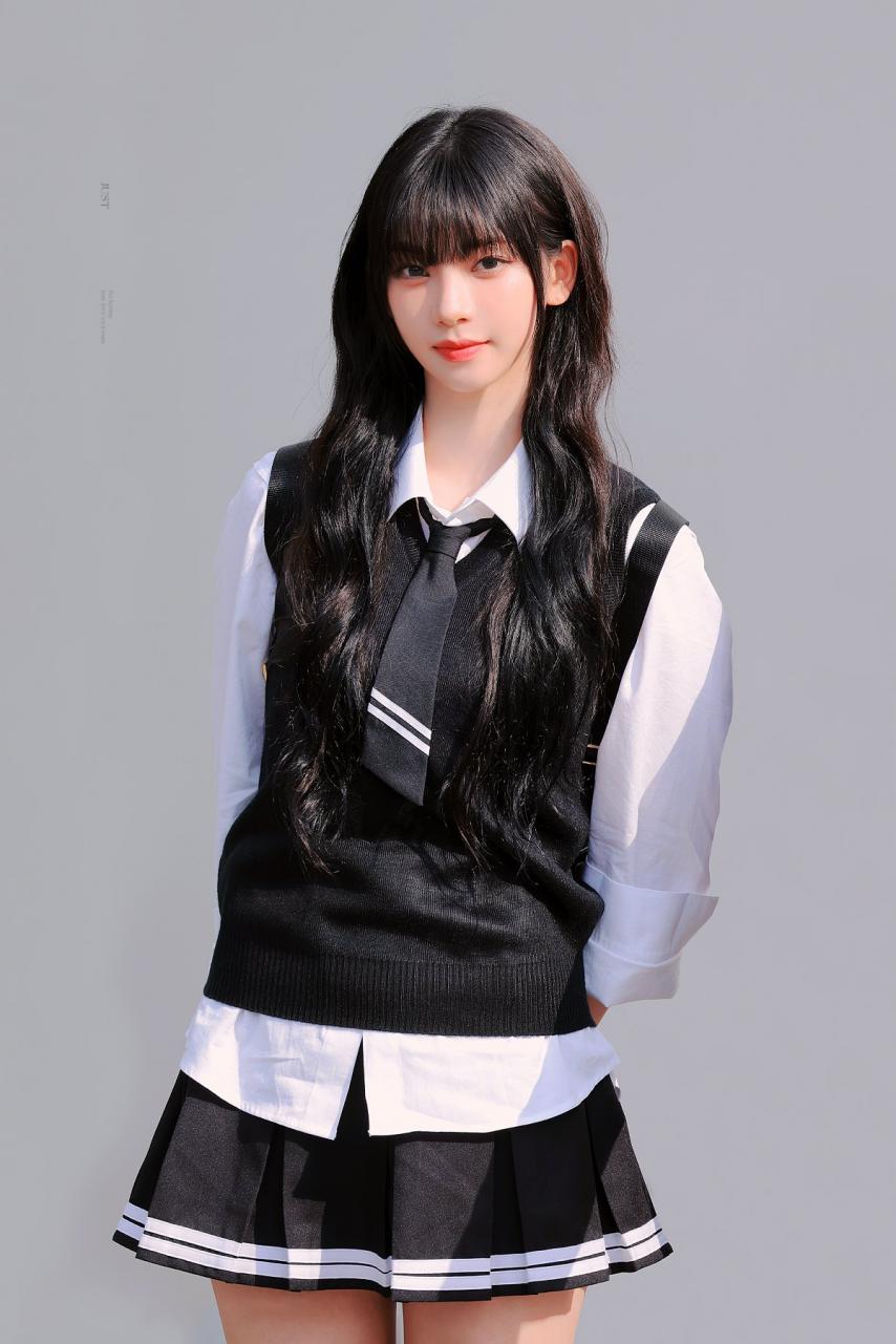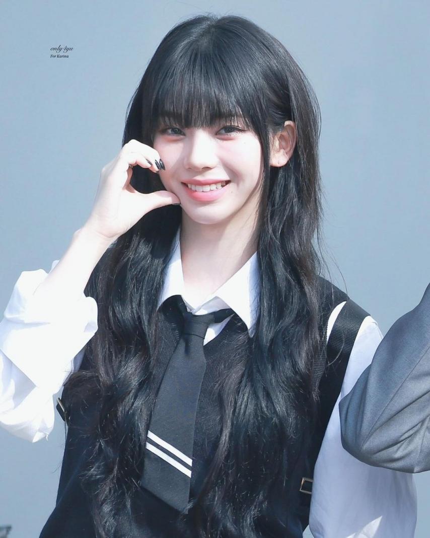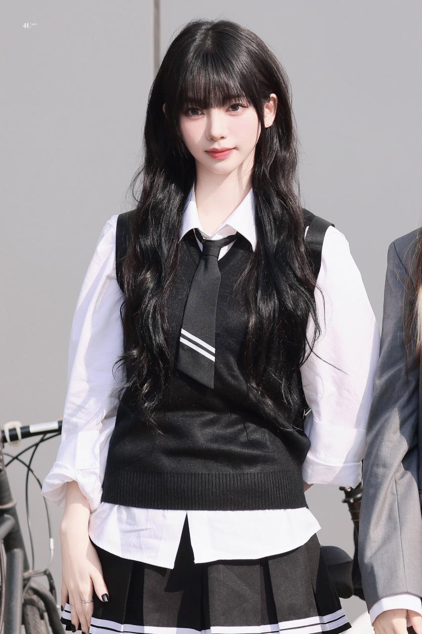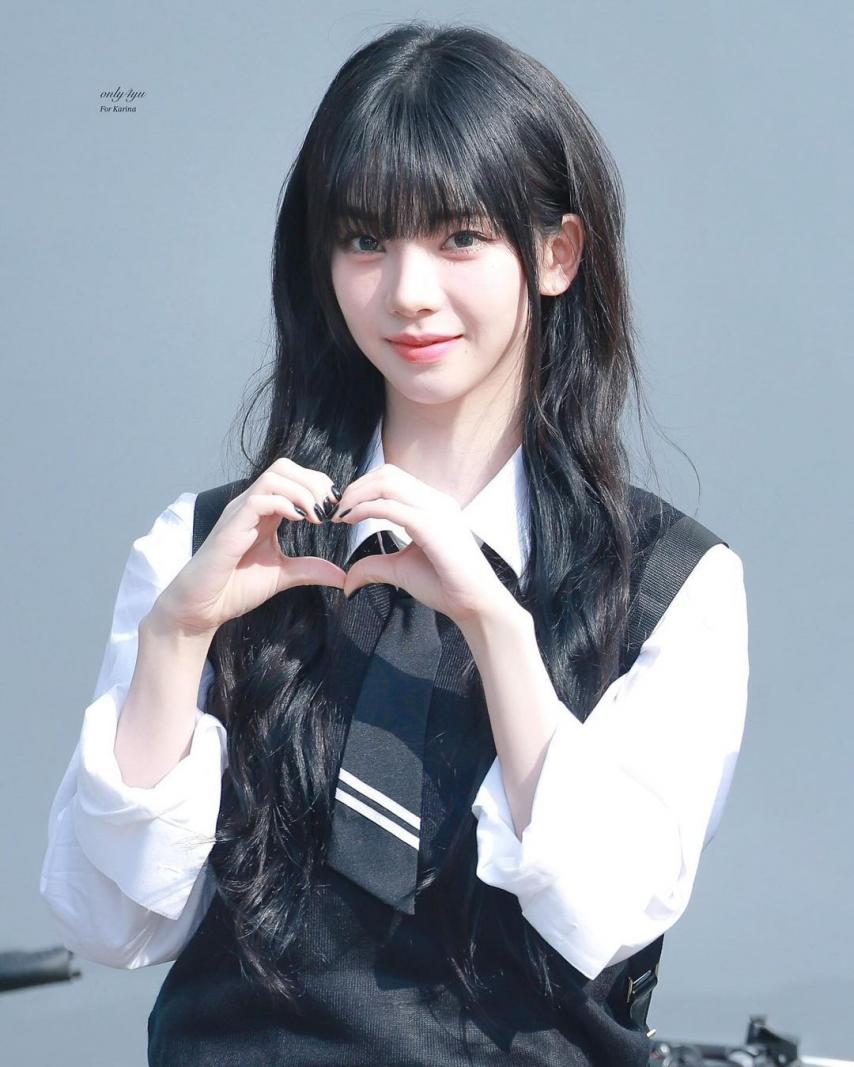 Karina wearing school looks gathered photos. Karina, dressed in school uniforms with bangs, combines a cute, student-like appearance with a fresh smile, making her incredibly beautiful.