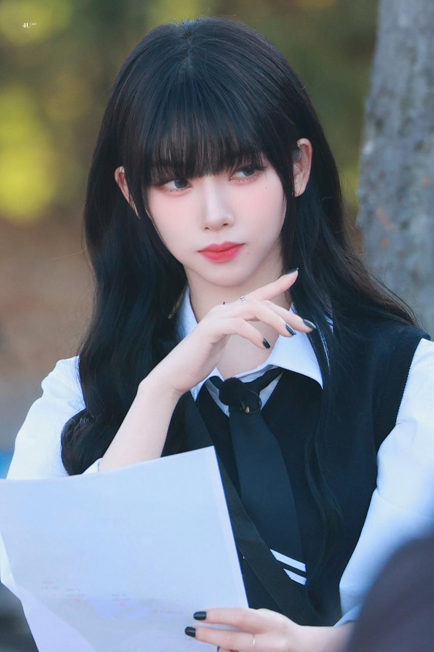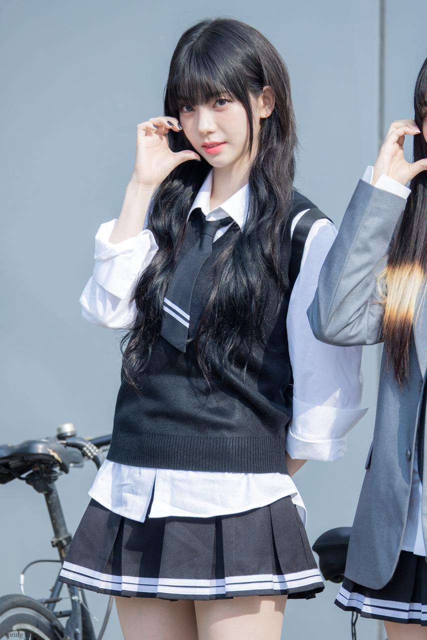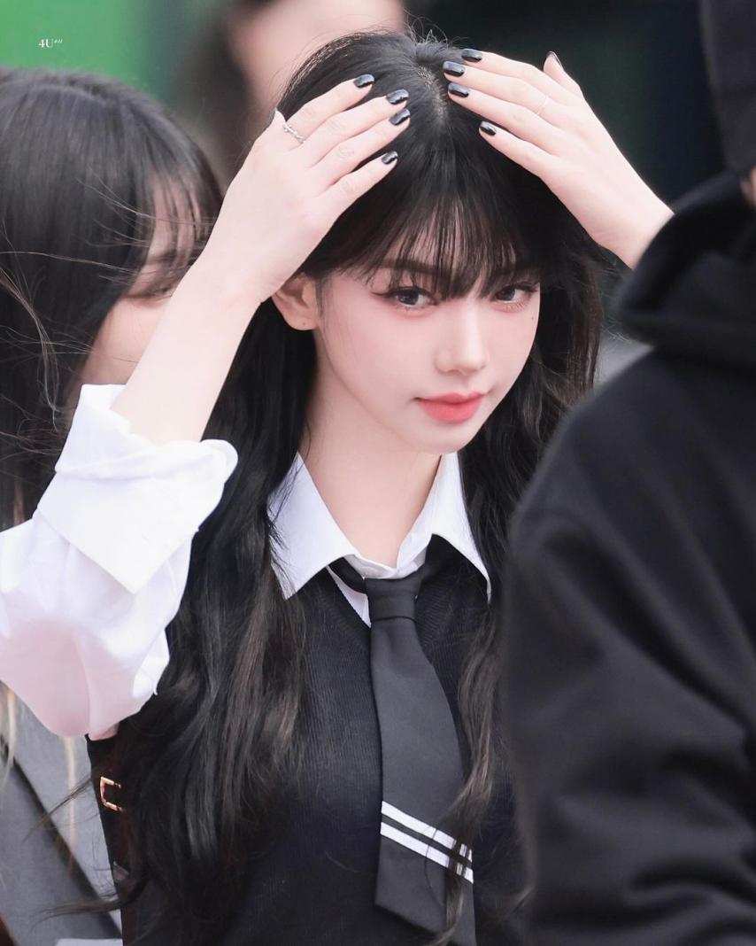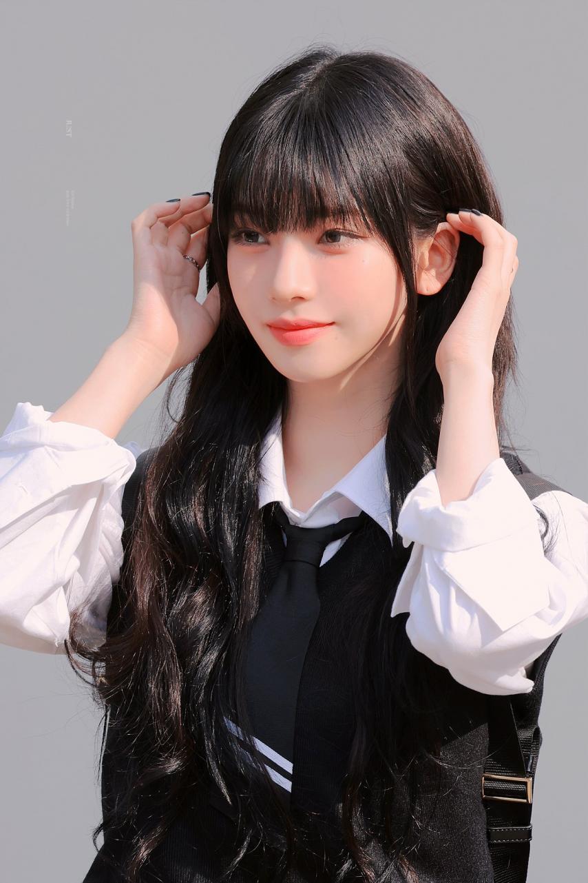 Karina wearing school looks gathered photos. Karina, dressed in school uniforms with bangs, combines a cute, student-like appearance with a fresh smile, making her incredibly beautiful.