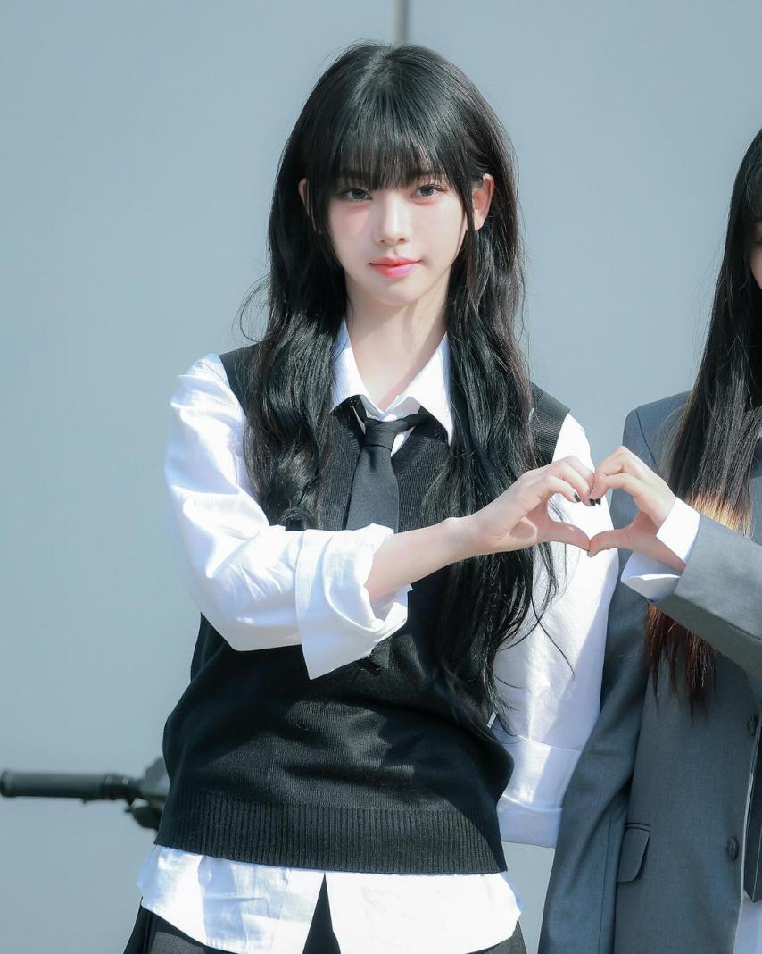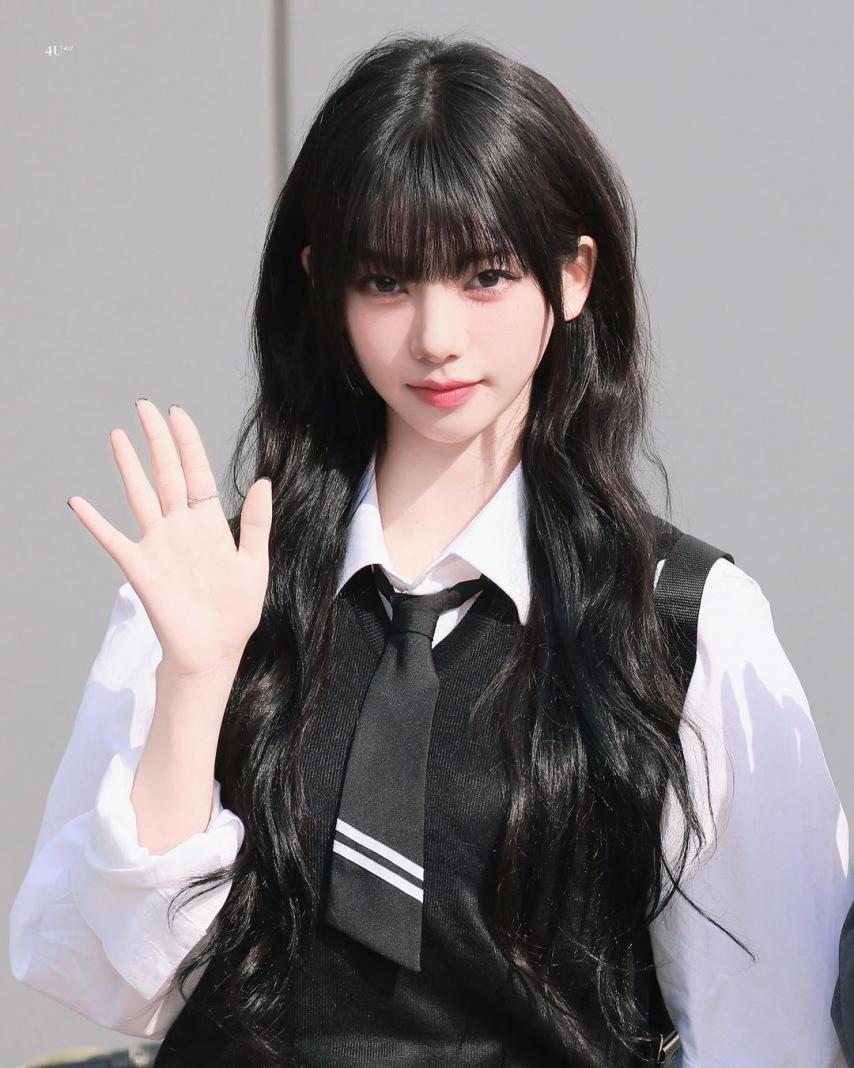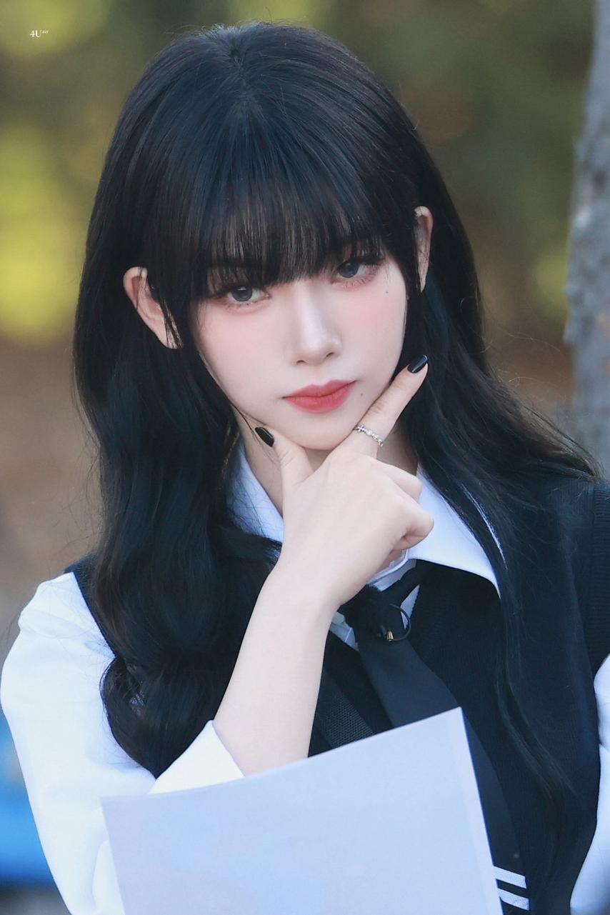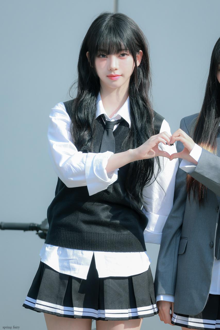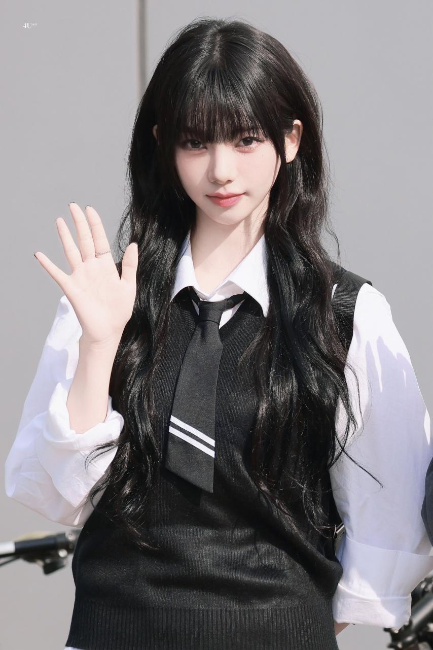 Karina wearing school looks gathered photos. Karina, dressed in school uniforms with bangs, combines a cute, student-like appearance with a fresh smile, making her incredibly beautiful.