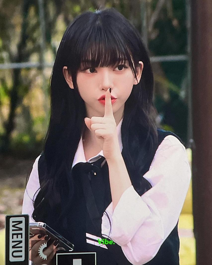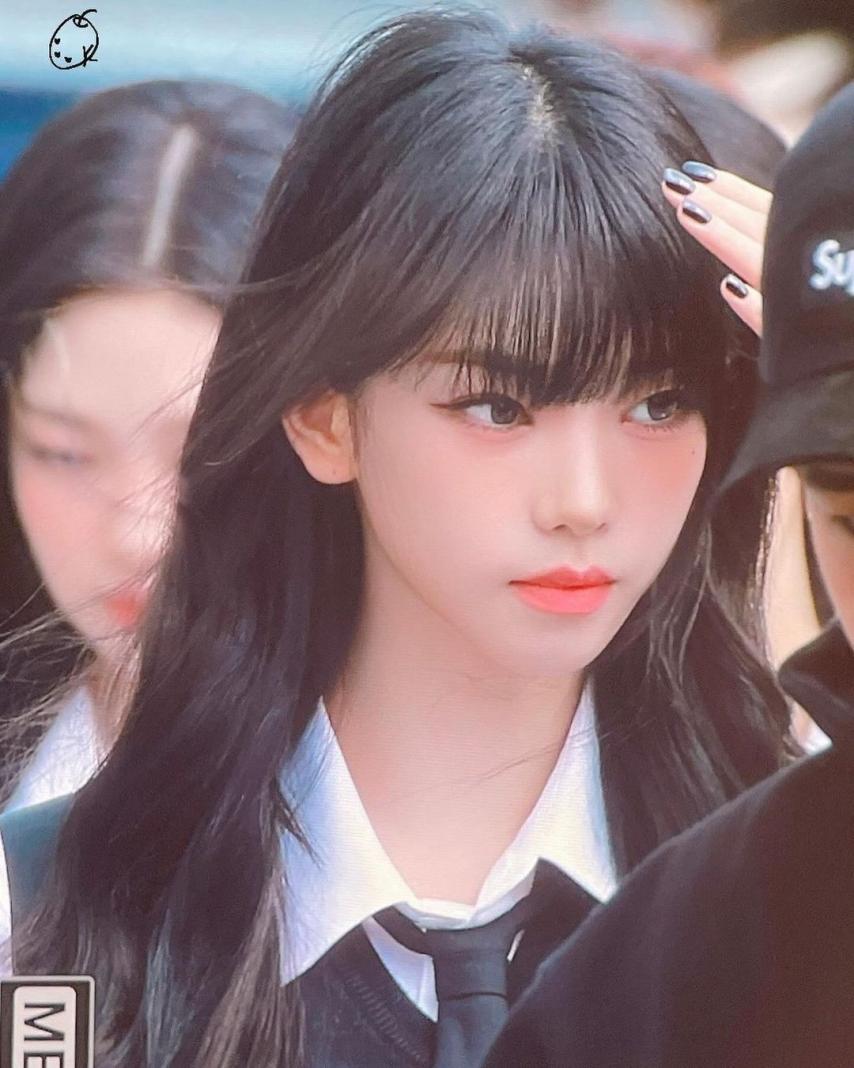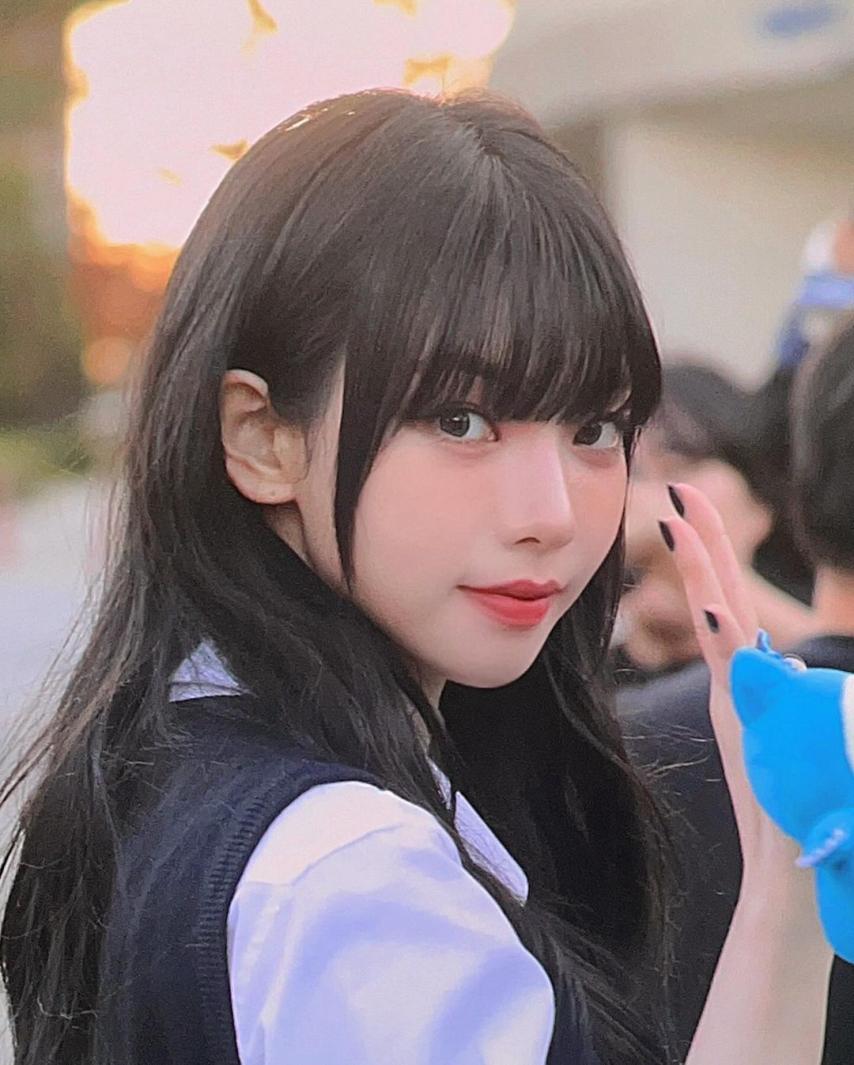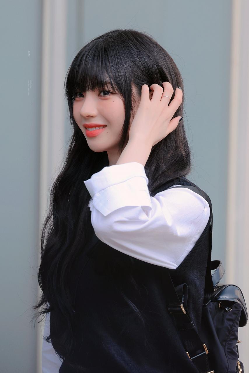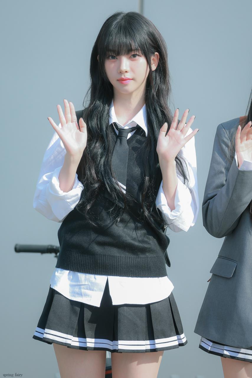 Karina wearing school looks gathered photos. Karina, dressed in school uniforms with bangs, combines a cute, student-like appearance with a fresh smile, making her incredibly beautiful.