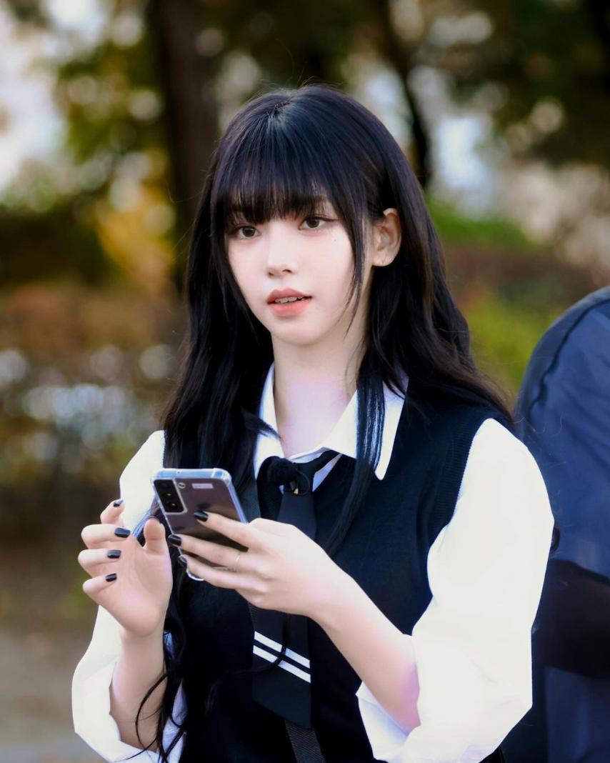 Karina wearing school looks gathered photos. Karina, dressed in school uniforms with bangs, combines a cute, student-like appearance with a fresh smile, making her incredibly beautiful.
