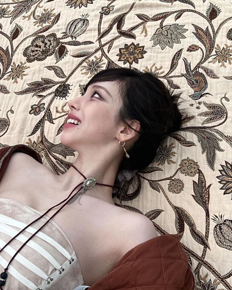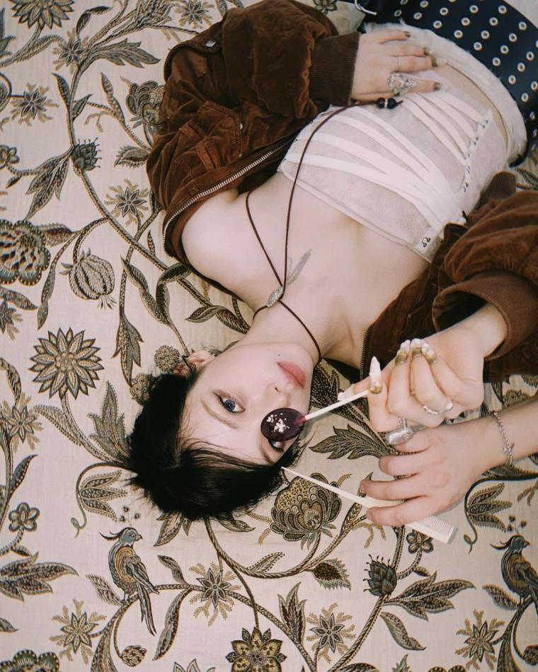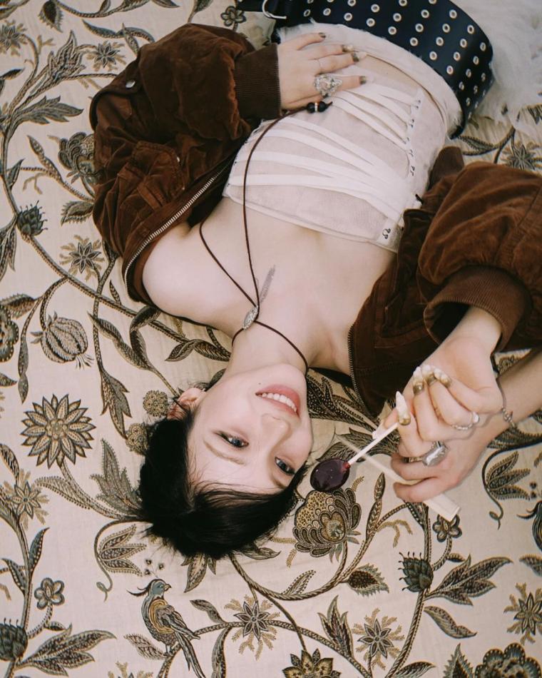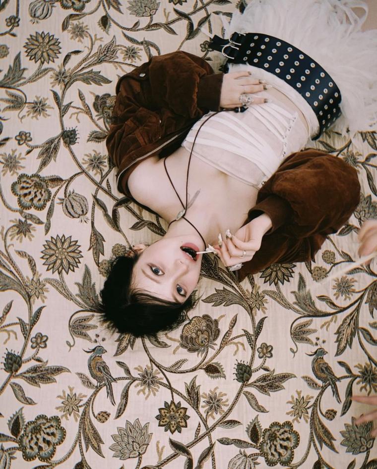In this stunning pictorial, aespa Karina serves a masterclass in facial expressions and posing. The photos feature a unique "high-angle" perspective, with Karina lying down against a beautifully intricate, floral-patterned tapestry. This angle is notoriously difficult to pull off, yet she manages to look effortless.