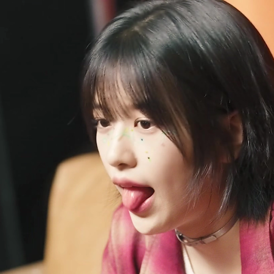 In this captured moment, Yujin is sporting her trendy short black hair and unique, colorful glitter makeup dotted across the bridge of her nose. Looking slightly off-camera, she gives a cheeky little tongue-out expression.