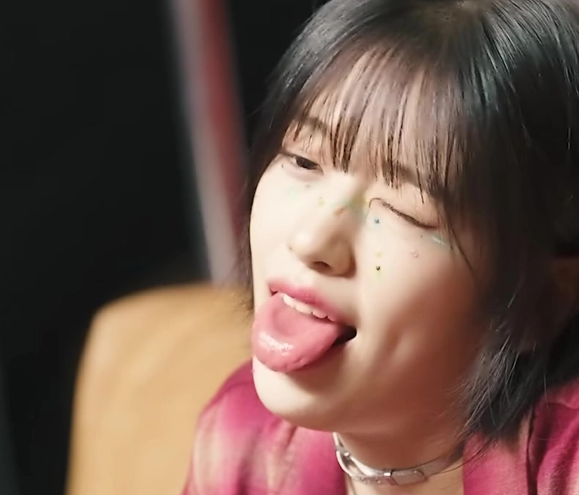 In this captured moment, Yujin is sporting her trendy short black hair and unique, colorful glitter makeup dotted across the bridge of her nose. Looking slightly off-camera, she gives a cheeky little tongue-out expression.