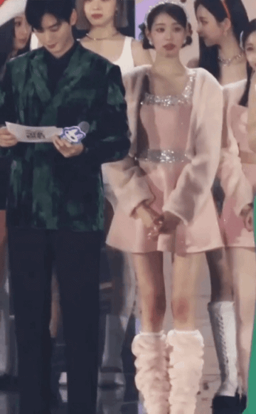 - Jang Won-young, celebrated for her doll-like features and incredible proportions, is radiant in a light pink mini-dress with sparkling embellishments and matching fluffy leg warmers. Her hair is elegantly styled with a headband, completing her angelic look.