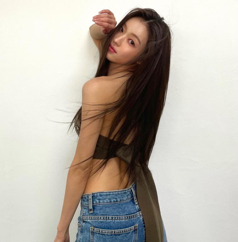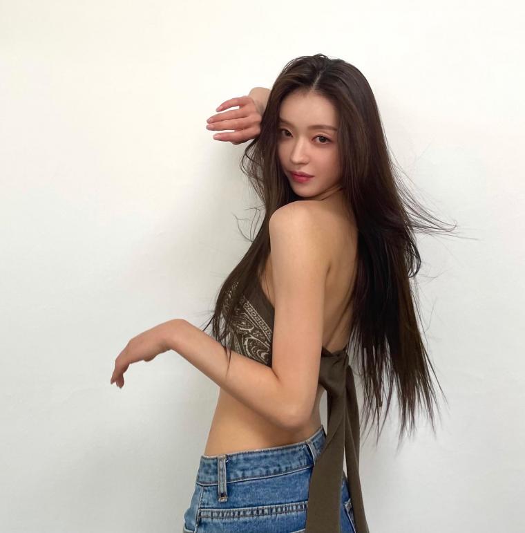 YooA showcases her perfect figure with flawless fashion. Oh My Girl's YooA shines with her bronzed skin, slim waist, and long flowing hair, enhancing her beauty.