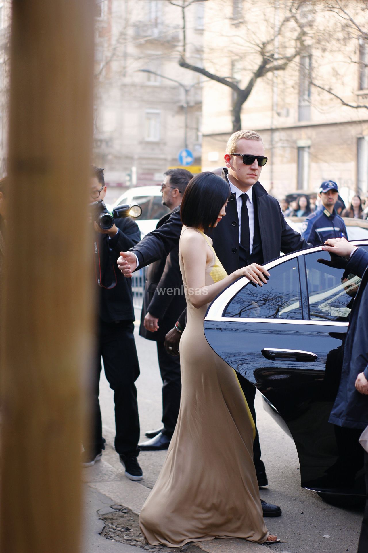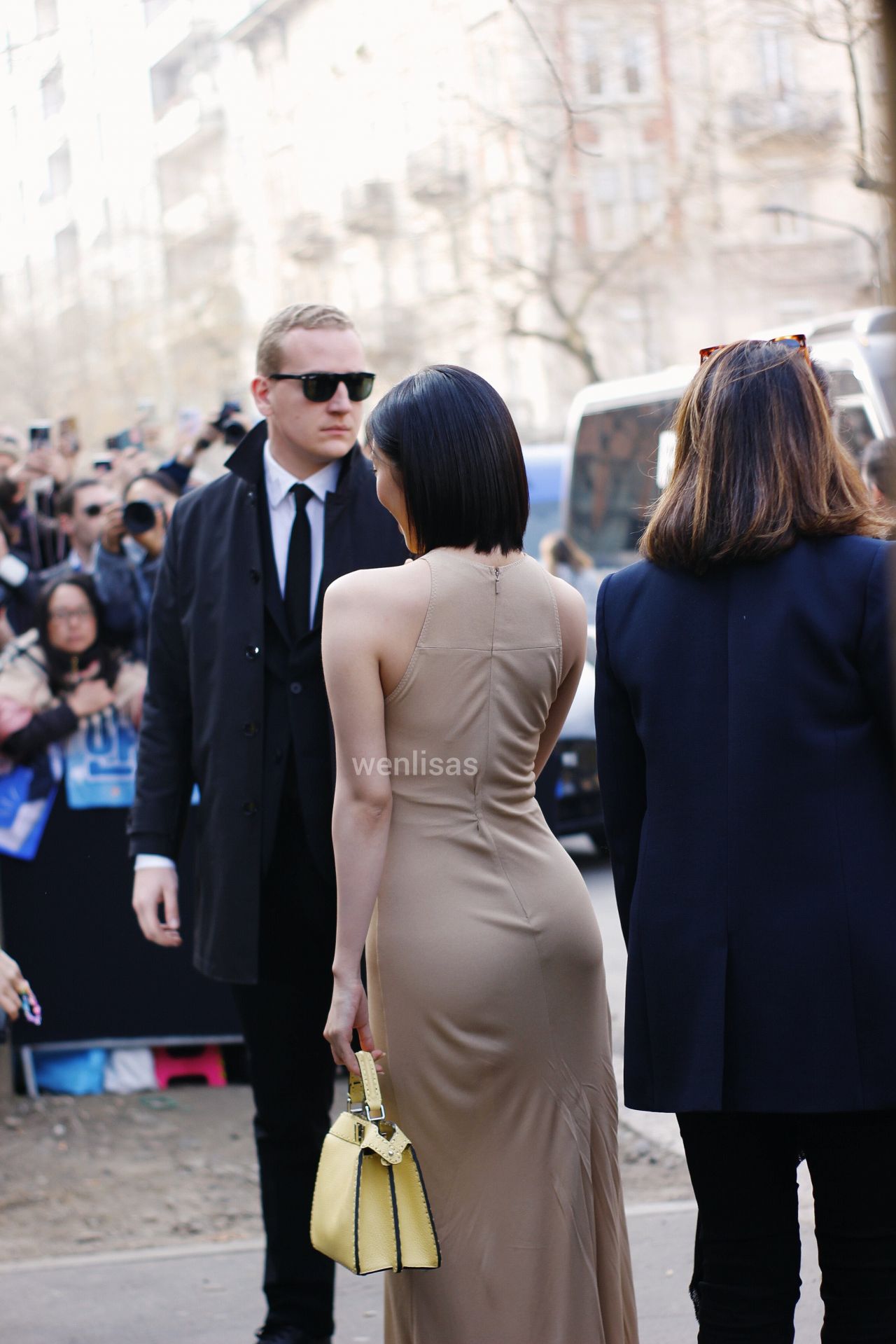 Styling-wise, Yujin kept it incredibly chic with her trendy short bob cut (a hairstyle that has become her signature look this season). The sleek dark hair contrasts beautifully with the warm tones of the dress. She accessorized with a structured yellow Fendi Peekaboo bag, adding a pop of color to the neutral palette.